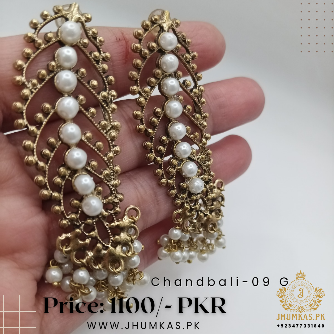 This is a pair of elegant Afghani Chandbali earrings. They feature a gold-toned, leaf-shaped metal base with intricate filigree and beadwork. A line of large white pearls runs down the center, and clusters of small white pearls dangle from the bottom. The design is antique-inspired and traditional, as indicated by the “Chandbali-09 G” label.