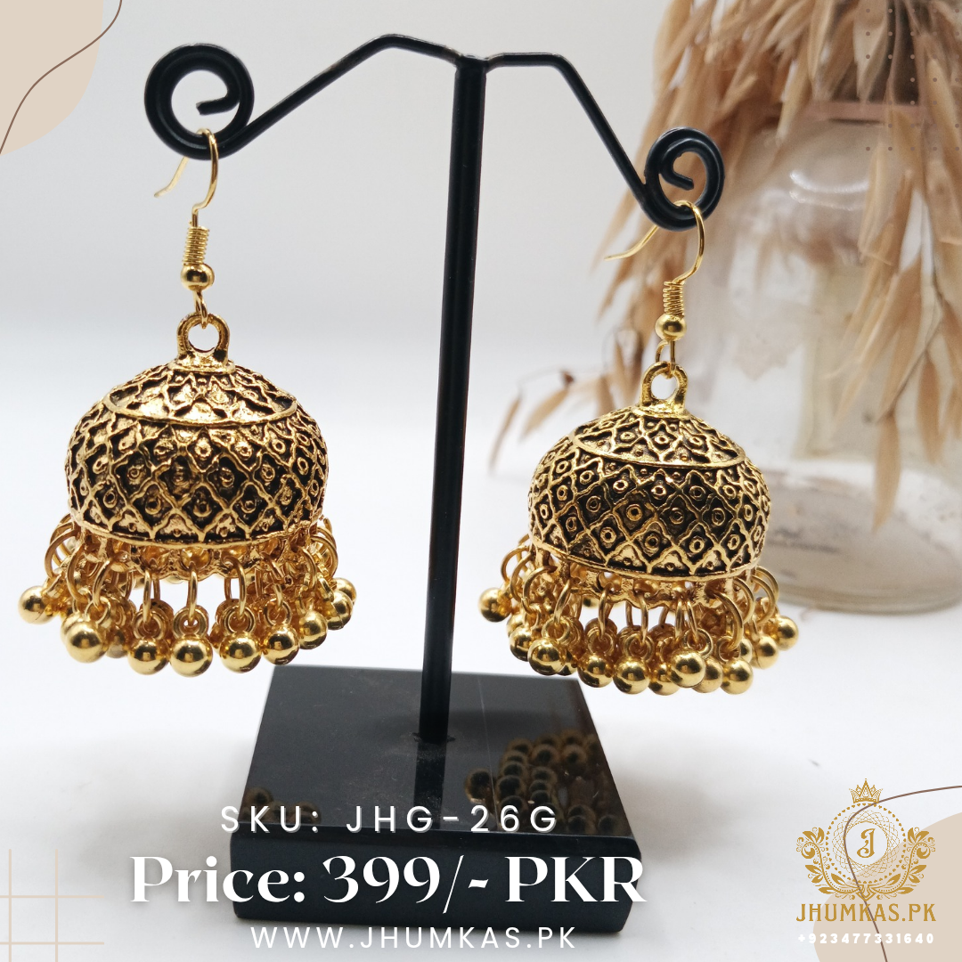 Embrace timeless tradition with this Antique Golden Jhumka, crafted to perfection with intricate detailing and a classic dome-shaped design. Its antique golden finish gives it a vintage charm, making it the perfect accessory for weddings, festive occasions, or cultural gatherings.