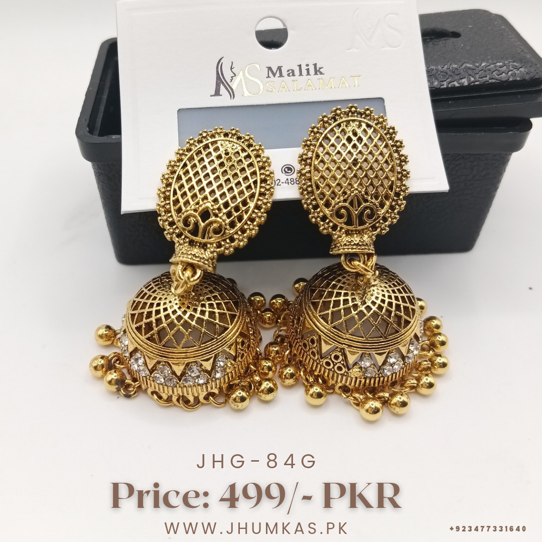 Make a stunning style statement with these Jhumka Earrings, beautifully crafted for festive and party occasions. The jhumkas feature a lotus-dome shape, adorned with intricate golden dotted detailing and soft pearl-like bead drops that add a graceful swing to every movement.