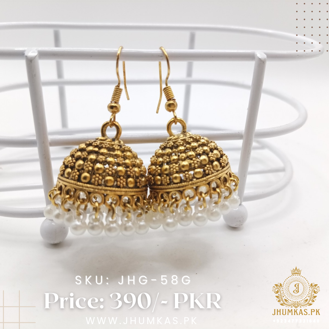 Embrace timeless tradition with this Antique Golden JhumkaGolden Jhumka Earrings With White Pearls, crafted to perfection with intricate detailing and a classic dome-shaped design. Its antique golden finish gives it a vintage charm, making it the perfect accessory for weddings, festive occasions, or cultural gatherings.