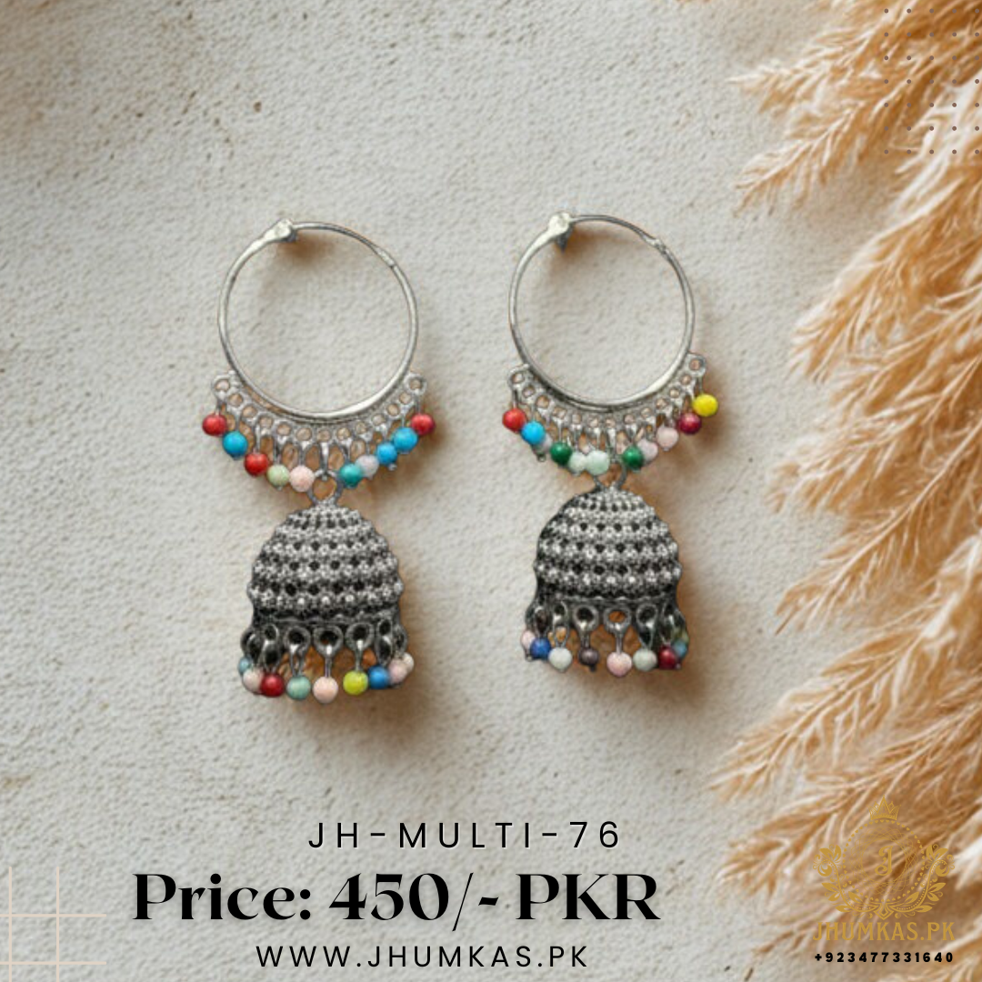 Add vibrant charm to your festive look with these Silver Jhumka Earrings with Multi beeds. Hand-painted with beautiful colors and intricate patterns, these jhumkas are designed to make you stand out at weddings, dholkis, mehndis, and festive parties.