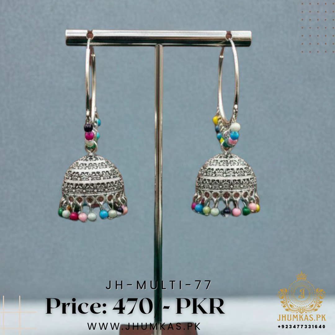 Add vibrant charm to your festive look with these Silver Jhumka Earrings. Hand-painted with beautiful colors and intricate patterns, these jhumkas are designed to make you stand out at weddings, dholkis, mehndis, and festive parties.